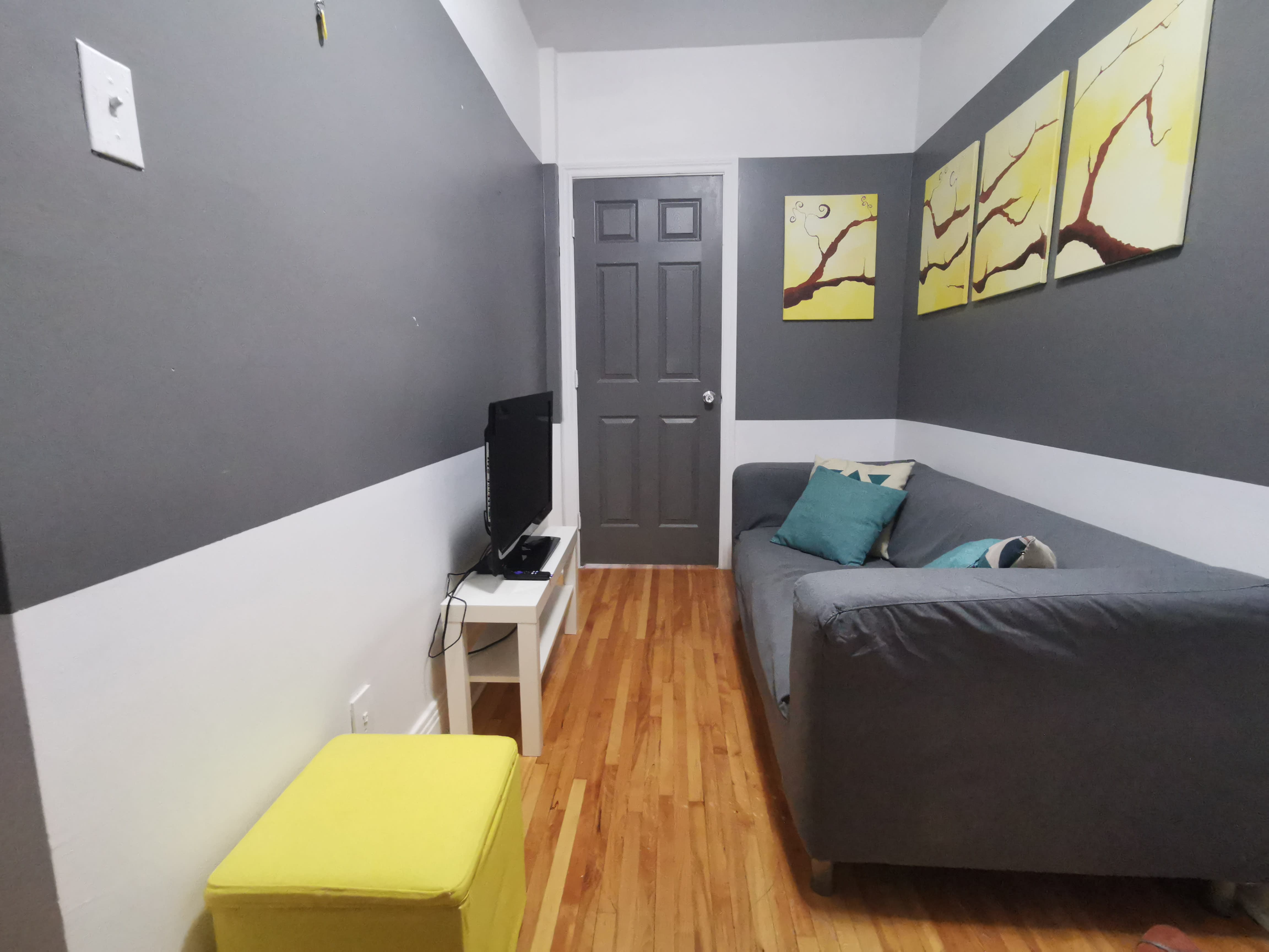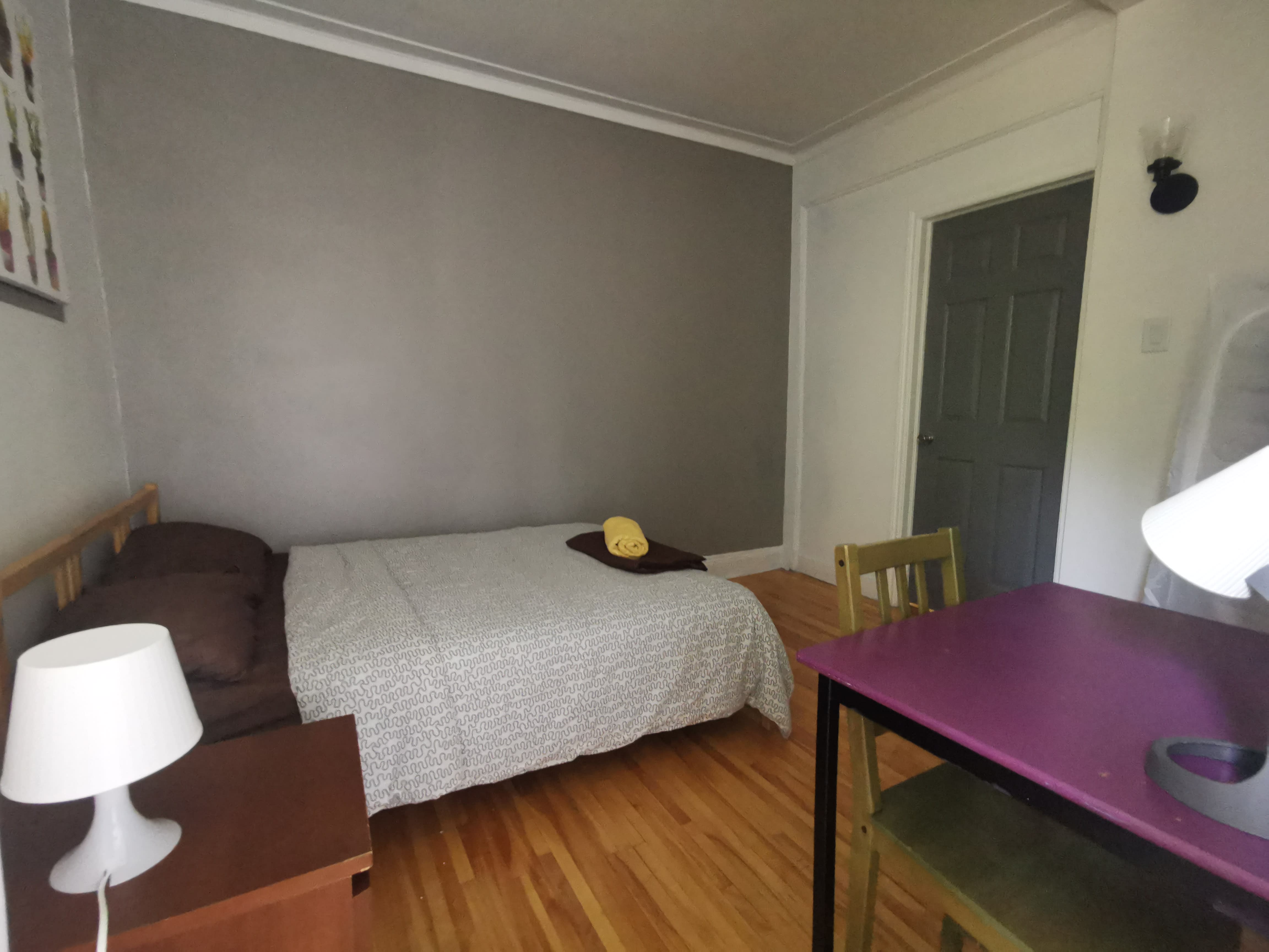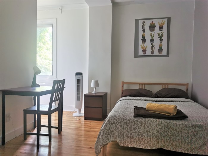 C'est la première chambre lorsque vous rentrerez dans l'appartement à gauche. Elle est spacieuse et toute en longueur. L'armoire vous permettra de ranger toutes vos affaires. La fenêtre se trouve tout au bout de la chambre, parfait pour les étudiants qui aiment une atmosphère moins lumineuse.