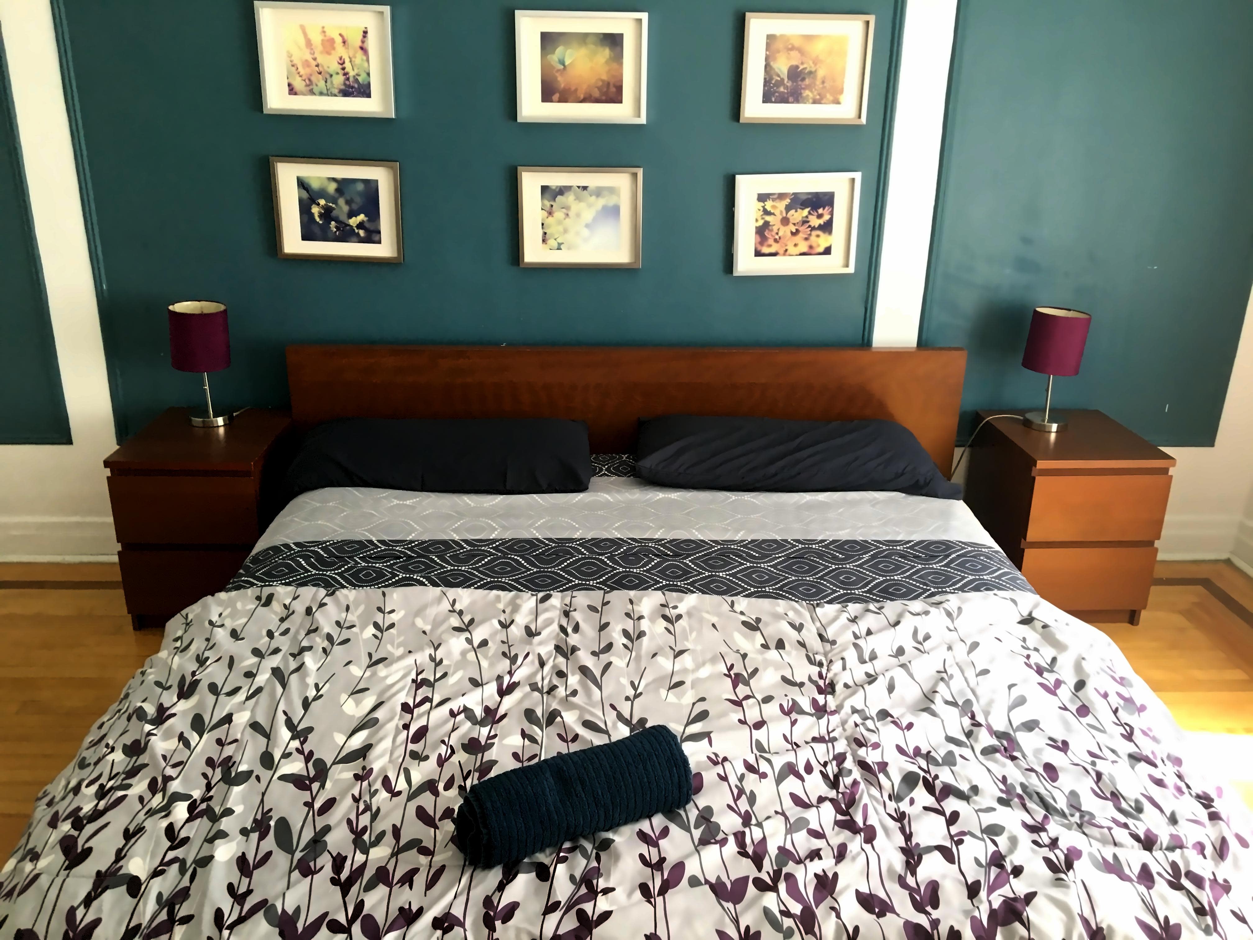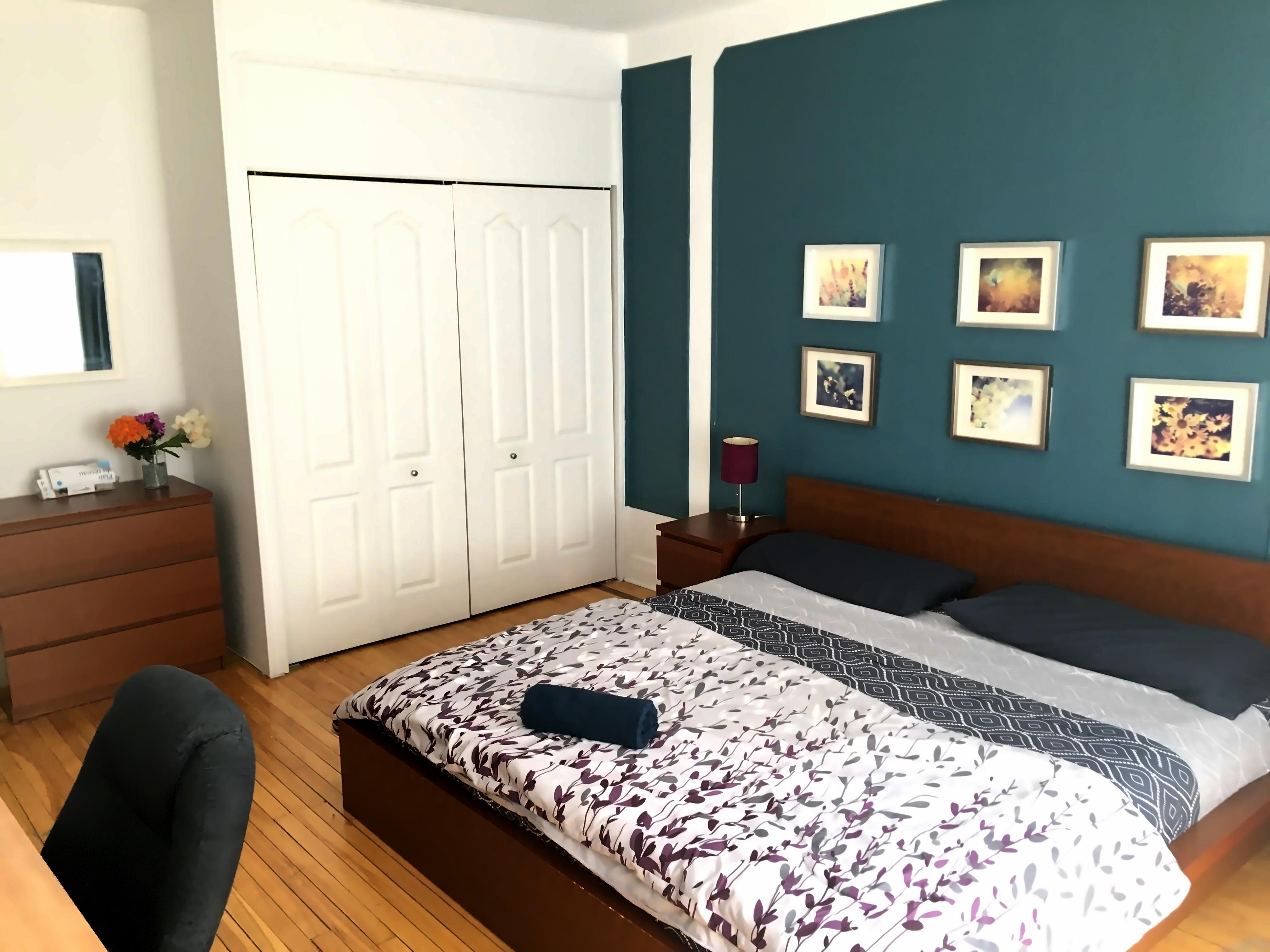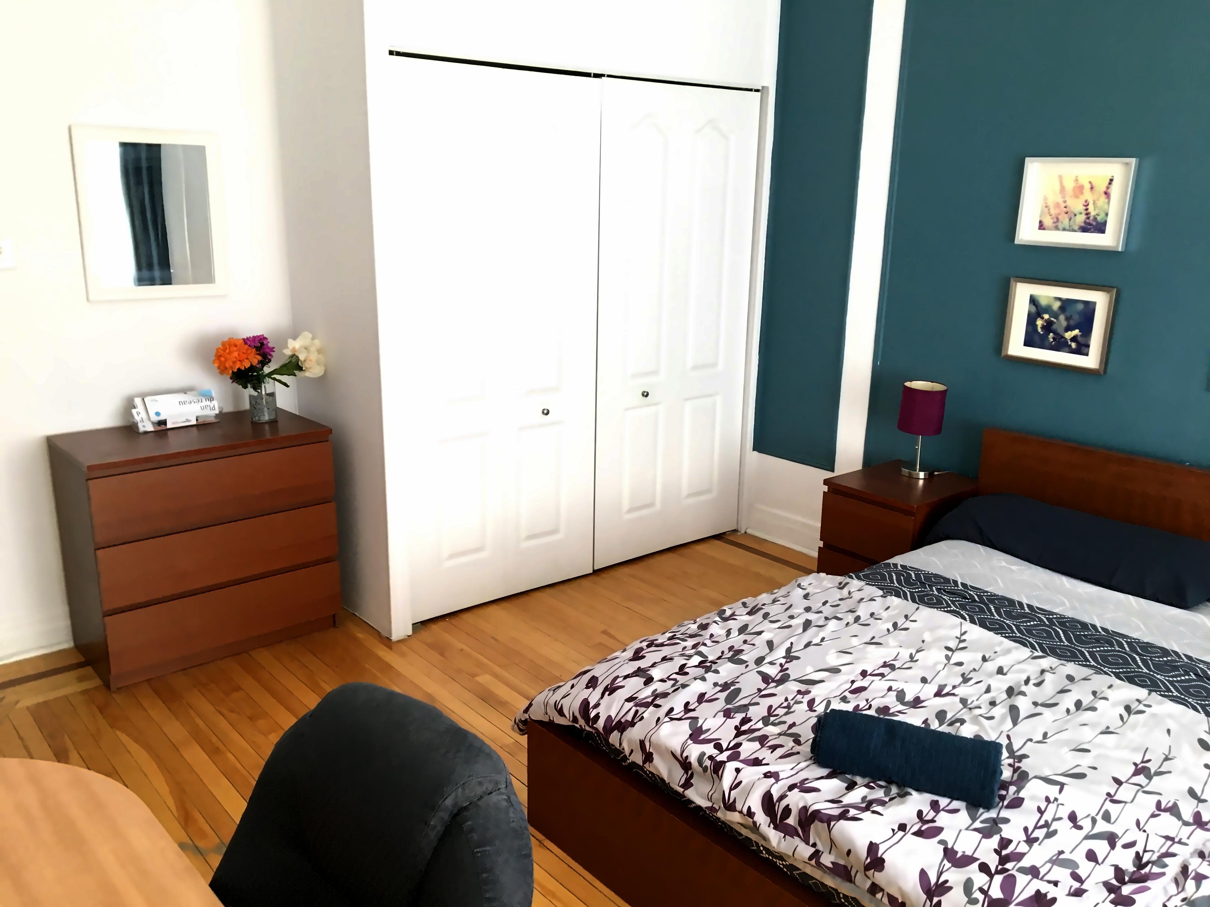 C'est la plus grande chambre de l'appartement, son immense lit king (200cmx200cm) vous garantira des nuits de sommeil réparatrices! Avec ses 3 fenêtres vous serez plongé dans un bain de luminosité constante! Son immense penderie ainsi que que ses 2 commodes, vous permettront de ranger toutes vos affaires sans aucun soucis!