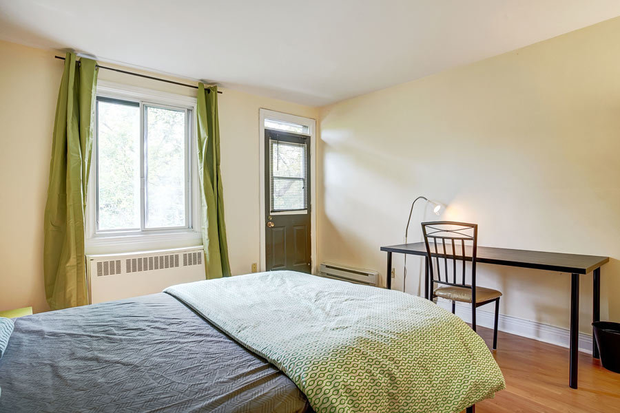 C'est la premiere chambre entrant à gauche. Elle donne sur l'entrée aménagée avec la TV. Grande et lumineuse elle est faite pour les étudiants qui aiment l'espace. Son armoire est très grande et son "espace lecture" réchauffera vos soirées hivernales. En tout temps vous pourrez sortir sur le balcon prendre un bol d'air frais!