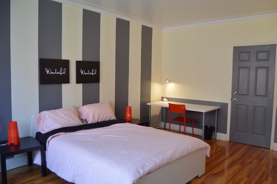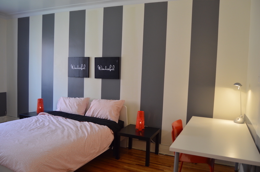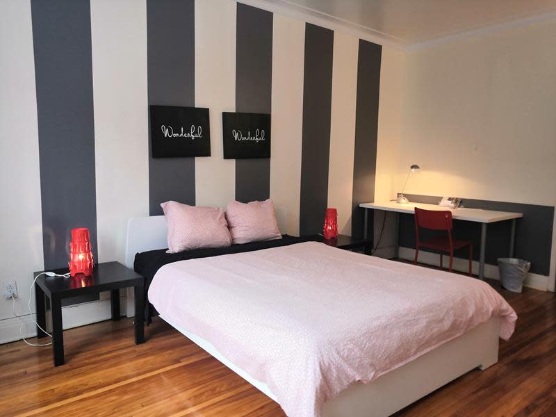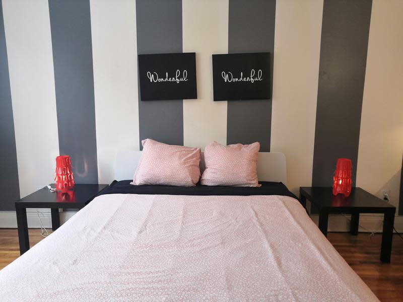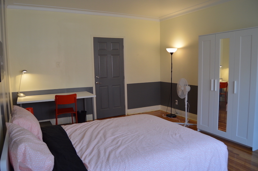 Grande chambre lumineuse avec lit queen. Elle est très lumineuse car elle comporte 3 fenêtres. Vous pourrez ranger toutes vos affaires sans problème. C'est la première chambre lorsqu'on rentre dans l'appartement.