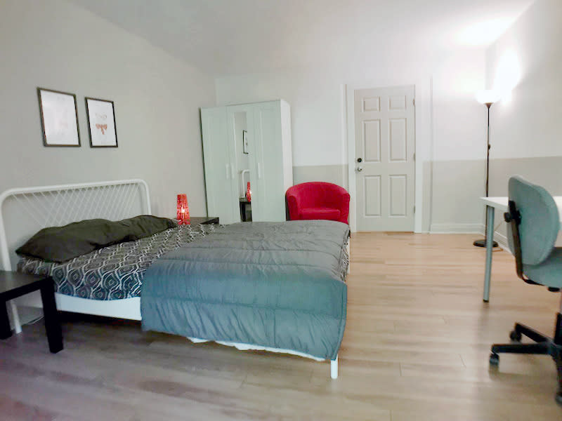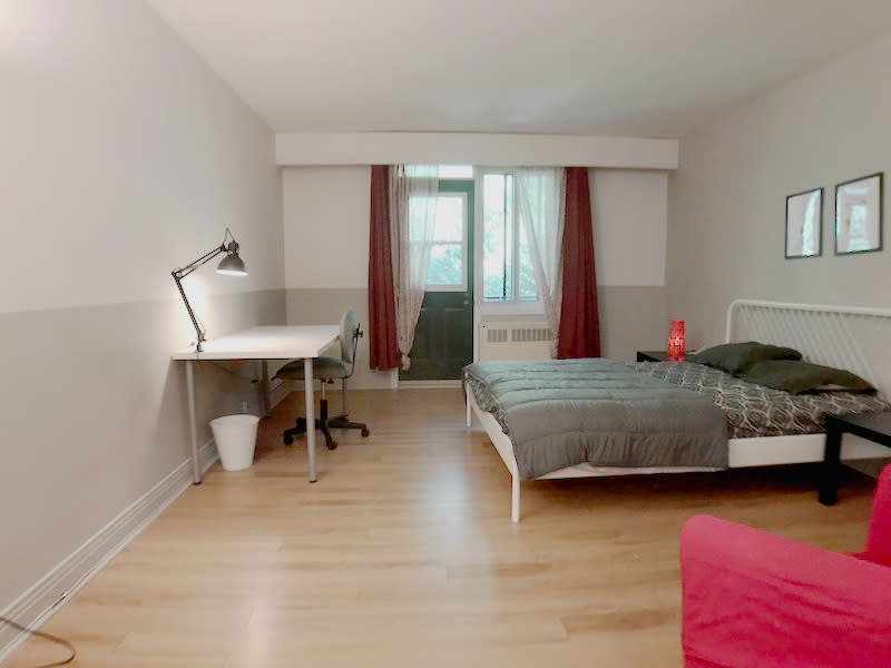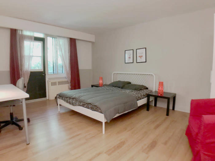 C'est la premiere chambre entrant à droite. Grande et lumineuse elle est faite pour les étudiants qui aiment l'espace. Son armoire est très grande et son "espace lecture" réchauffera vos soirées hivernales. En tout temps vous pourrez sortir sur le balcon prendre un bol d'air frais!