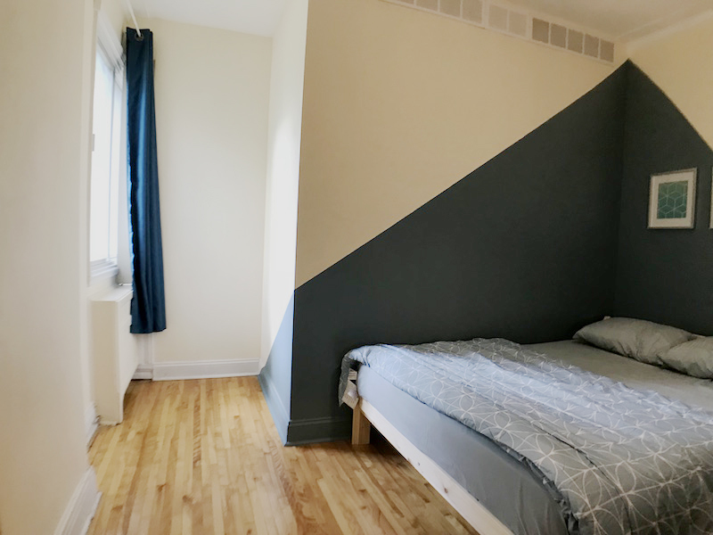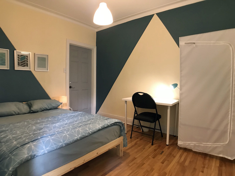 C'est la première chambre lorsque vous rentrerez dans l'appartement à gauche. Elle est spacieuse et toute en longueur. L'armoire vous permettra de ranger toutes vos affaires. La fenêtre se trouve tout au bout de la chambre, parfait pour les étudiants qui aiment une atmosphère moins lumineuse.